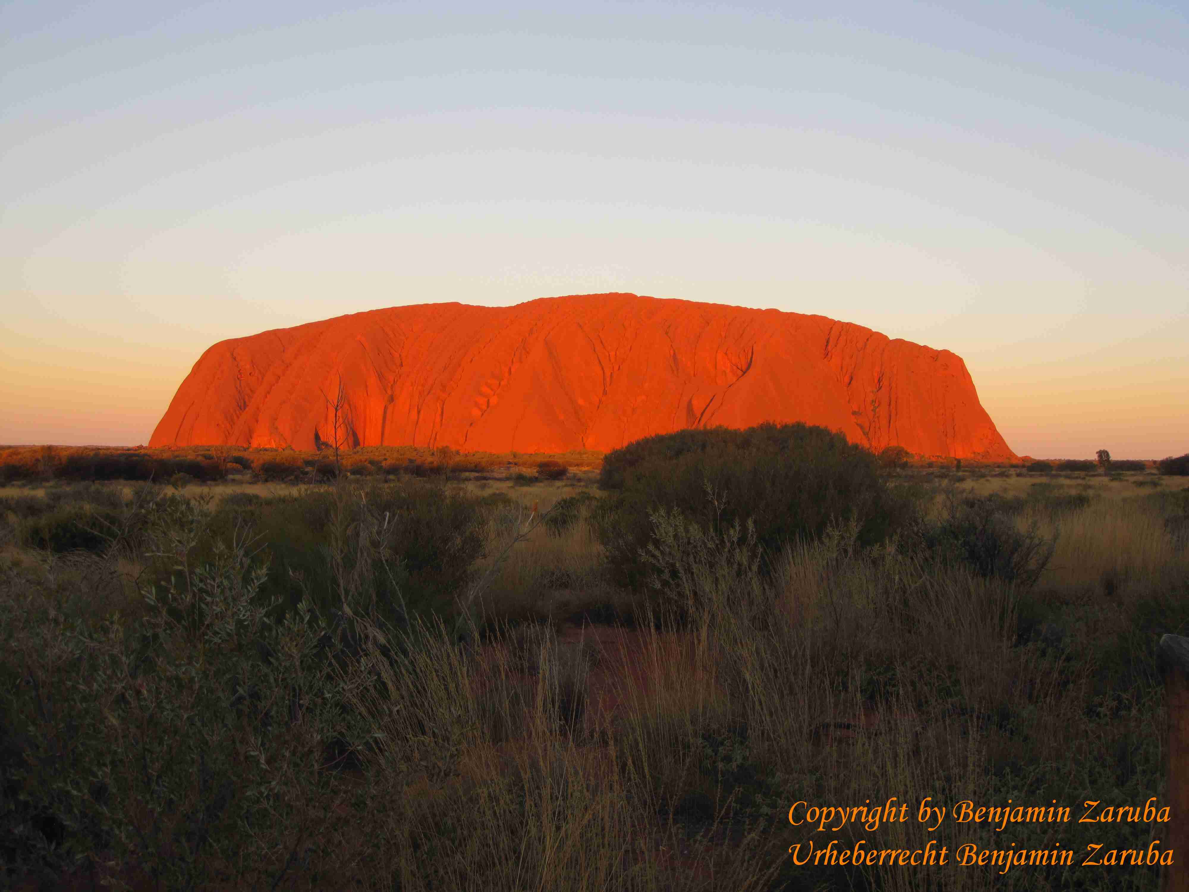 Nun, am darauffolgenden Tag bin ich um 5Uhr aufgestanden. Ja ihr habt das richtig gelesen um 5Uhr freiwillig! Nur um den Sonnaufgang beim Uluru anzuschauen! Also dieser Berg kann man nicht beschreiben man muss ihn gesehen und gespuehrt haben, mit seiner ganzen Macht! Er steht fast komplett alleine in der Gegend frei herum! Ich kann es auch nicht verstehen warum die Leute da rauf wollen! Man muss nicht alles besteigen! Und nach dem Sunrise habe ich noch eine kleine Wanderung um den Berg gemacht! Der ca. 10km lang war und hat ca. 4 Std. gedauert! Na ein Glueck das es schon Herbst ist und nicht Sommer, denn im Sommer haette ich um 11Uhr wieder zurueck sein muessen beim Auto, da Temperaturen von ueber 45Grad herrschen koennen! Am Abend bin ich nochmals zu ihm gefahren und hab mir den Sunset angeschaut.