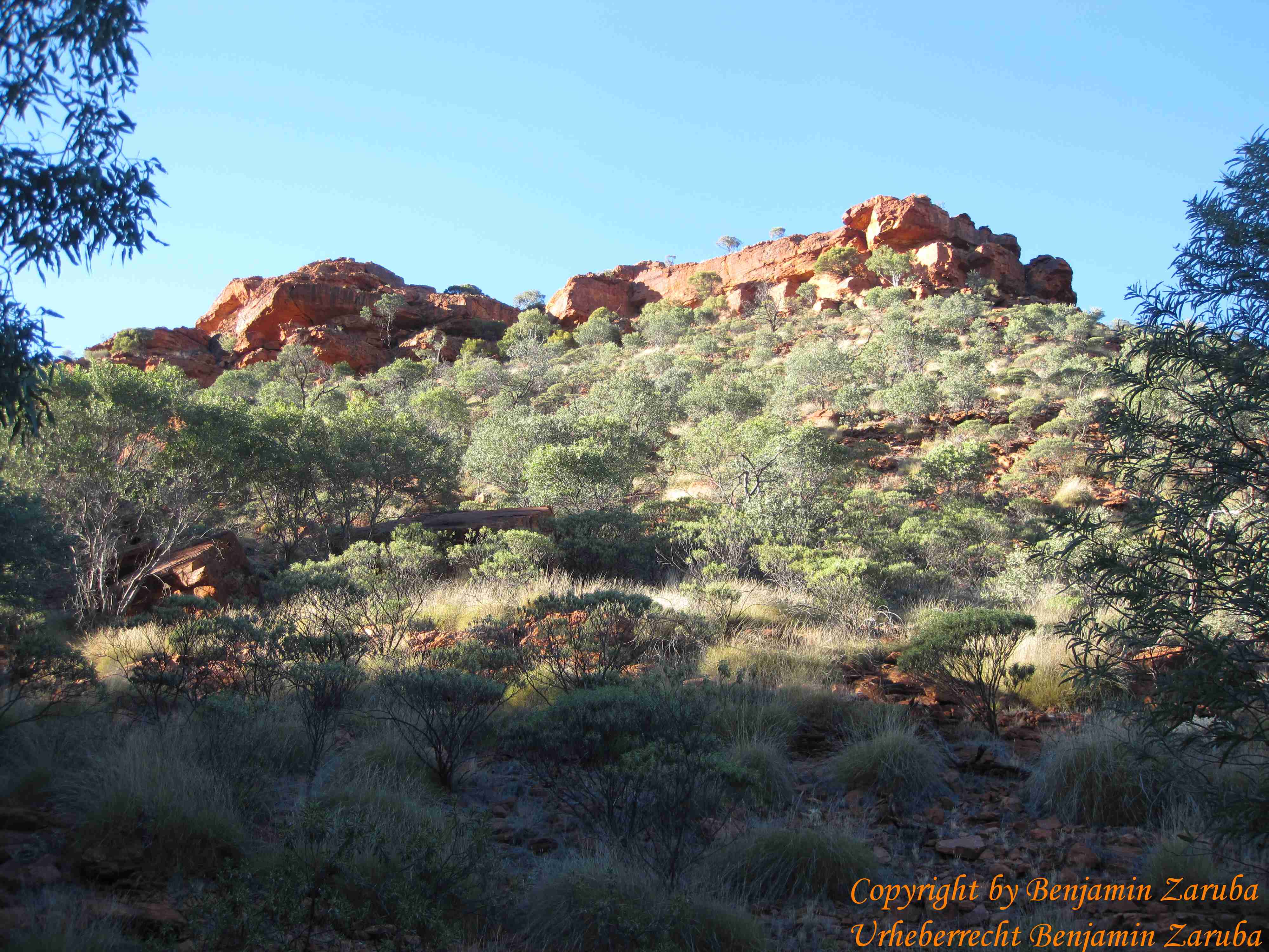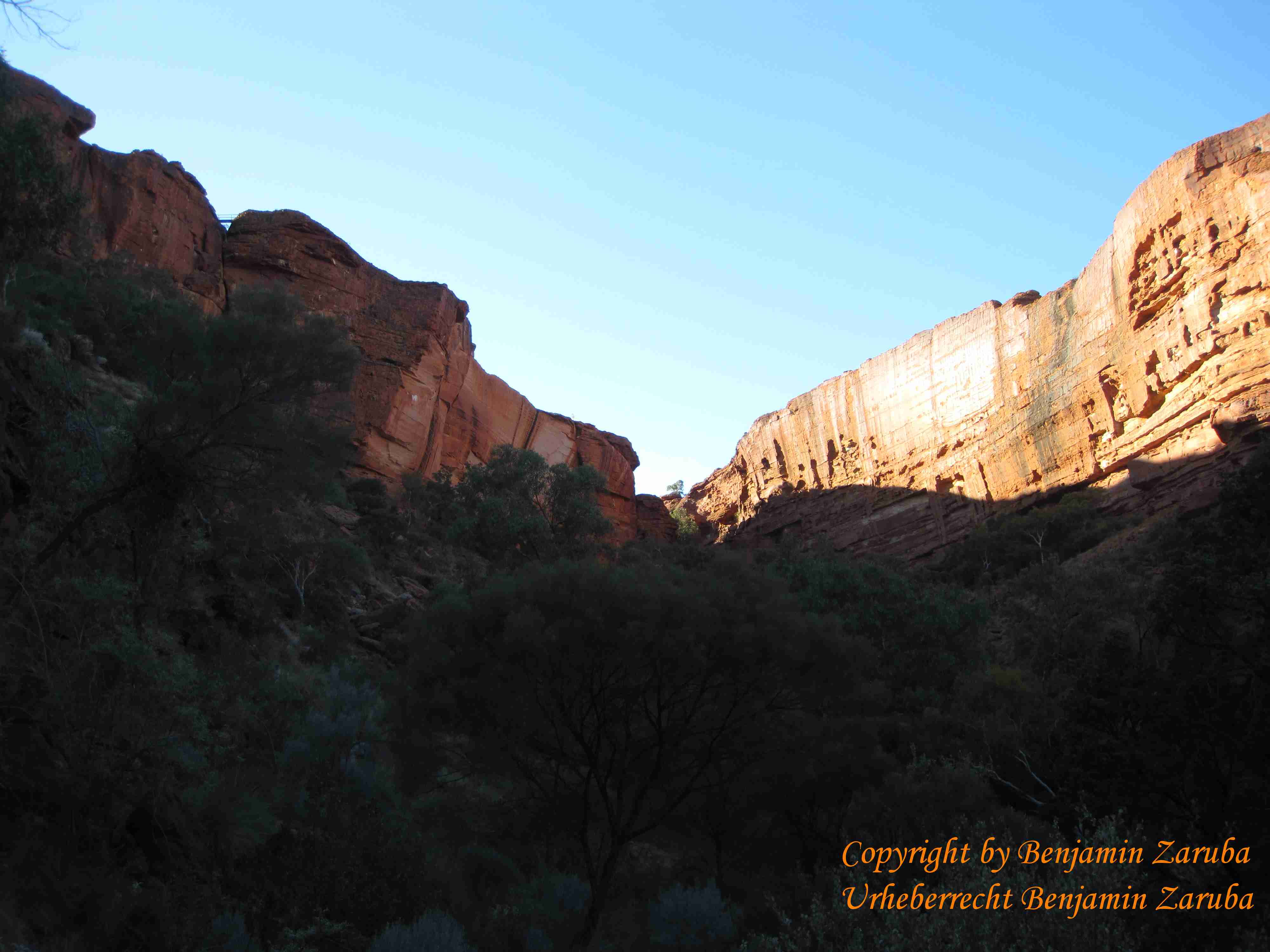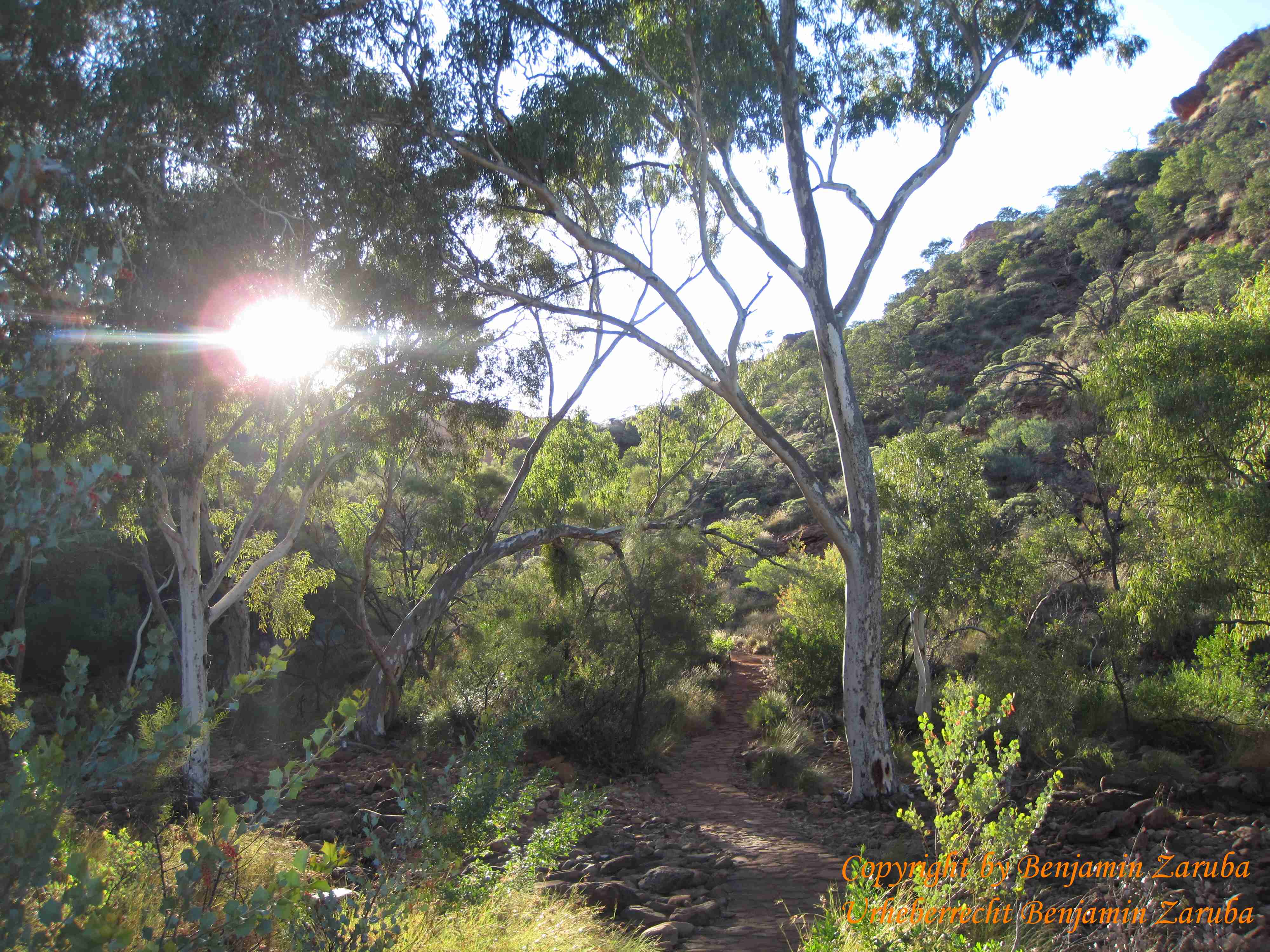 Am naechsten Tag ging es zum Kings Canyon, ich hab den Walk Kings Canyon Walk nicht gemacht nur den Kings Canyon Creek Walk! Der ging in den Canyon hinein. Die Aborigines haben seit her die Baeume in diesem Canyon nie beruehrt und nicht einmal Feuerholz gesammelt! Es ist eine Heilige Staette fuer sie und es ist sie immer noch! Aber leider gibt es immer noch Idioten die nicht lesen koennen und das nicht Respektieren koennen und ritzen ihren Namen in die Baeume!
